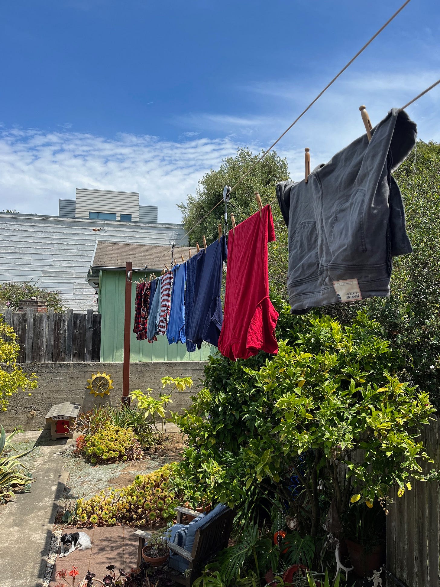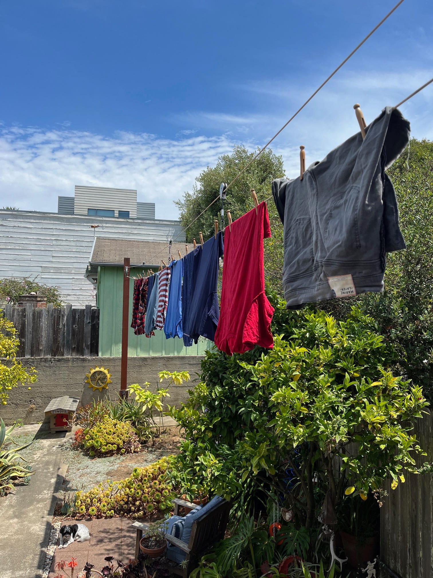 About the clothesline in the backyard, it’s kind of a pain, but very therapeutic. I literally think about Vladimir Putin every time I hang towels on the line and ponder the natural gas I’m not using as a result. It’s one of the few moments in my life when I feel like I have actual leverage over capitalism. The drying rack in the kitchen doesn’t give the same exact thrill—no direct contact with the sun or outside air—but as my brother and I learned from the Germans, it doubles as a no-cost humidifier.